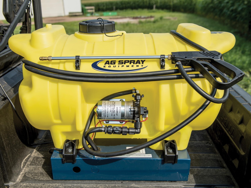 The 40 Gallon Super Spot Sprayer is most widely used for weed and pest control. The UV resistant, molded polymer tank has a 5 inch tethered lid for easy access and is completely drainable. This unit features Shurflo 2.2 GPM, 100PSI Pump. The Deluxe Pistol Grip Spraygun distributes up to 40 feet of horizontal spray, 28 feet of vertical spray and comes with 25 feet of 3/8 inch hose.