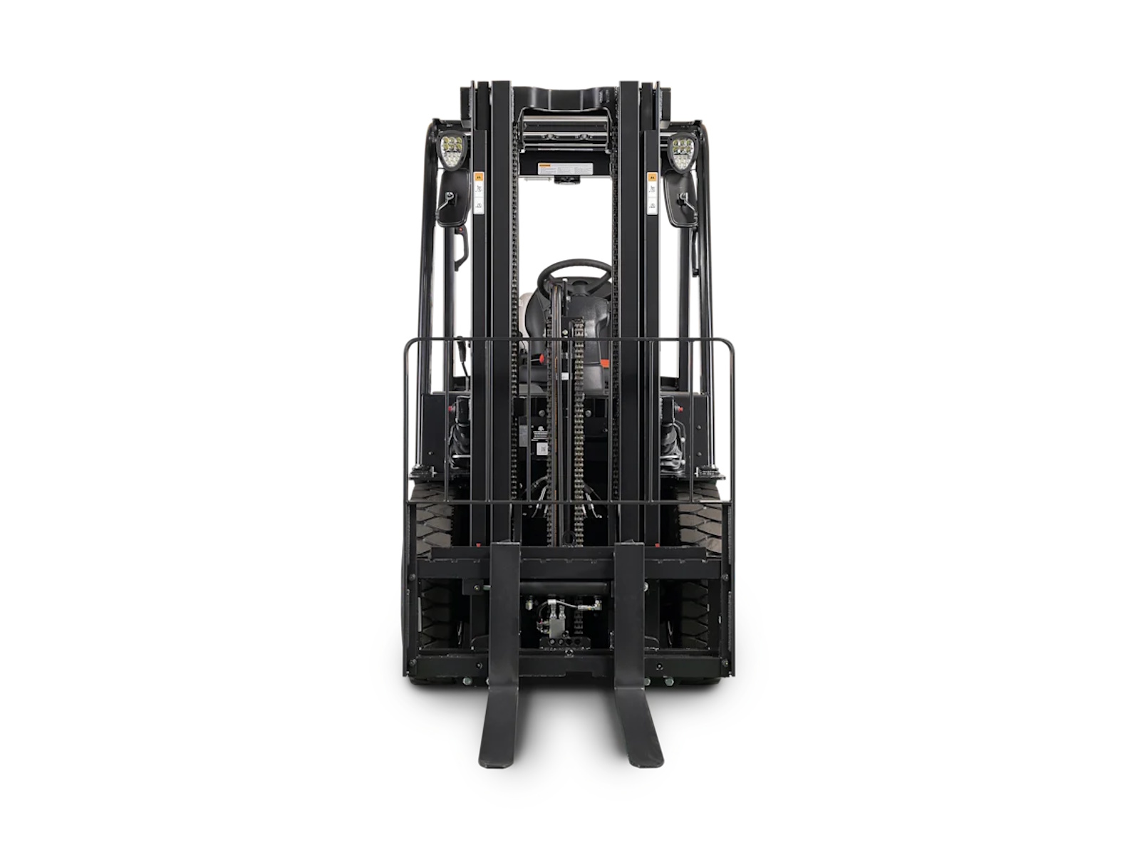 - The forklift has hydraulic hoses and mast chains which are strategically placed to enhance forward visibility.