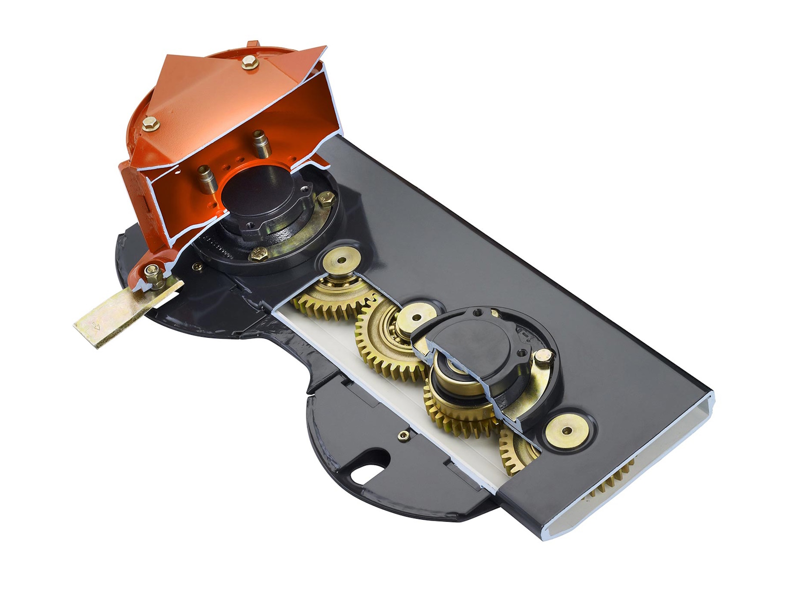 - The complete mowing section, including the conditioner, is suspended independently from the main chassis by either two or four long adjustable suspension springs, allowing field tracks and contours to be closely followed. If an obstacle is encountered in the field, the mowing section will lift up and backwards, protecting the cutterbar from damage. When the obstacle is passed, the mowing section automatically returns to the working position.