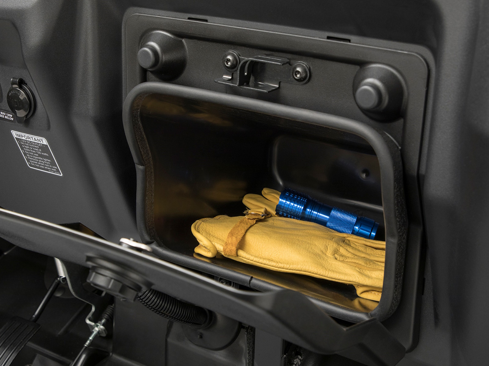- Large compartments under the split-bench seats are ideal for storing tools, tie-downs and personal items. A convenient cup holder keeps your beverage tumbler or travel mug secure and always within reach. A large glove box on the passenger side provides quick and convenient access to personal items and frequently used gear, and is equipped with a lock for securing personal items.