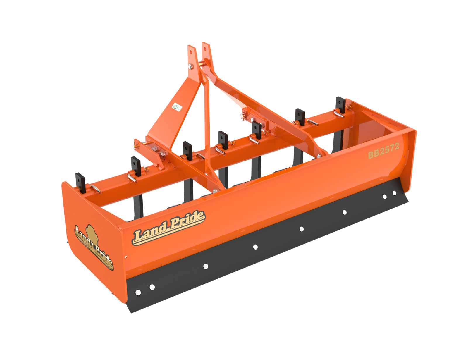 Land Pride's BB25 Series Fixed Bar Box Scrapers are ideal for building sites, feedlots, outdoor arenas, and on farm and ranch lanes or roadways. Two welded braces extending from front to rear of bucket plus welded gussets between the side panels and moldboard provide exceptional strength for keeping the Box Scraper square under heavy loads. Dirt rolls off of the roll-formed moldboard while scraping, creating less drag and you will get twice the wear on the cutting edge due to its reversability.