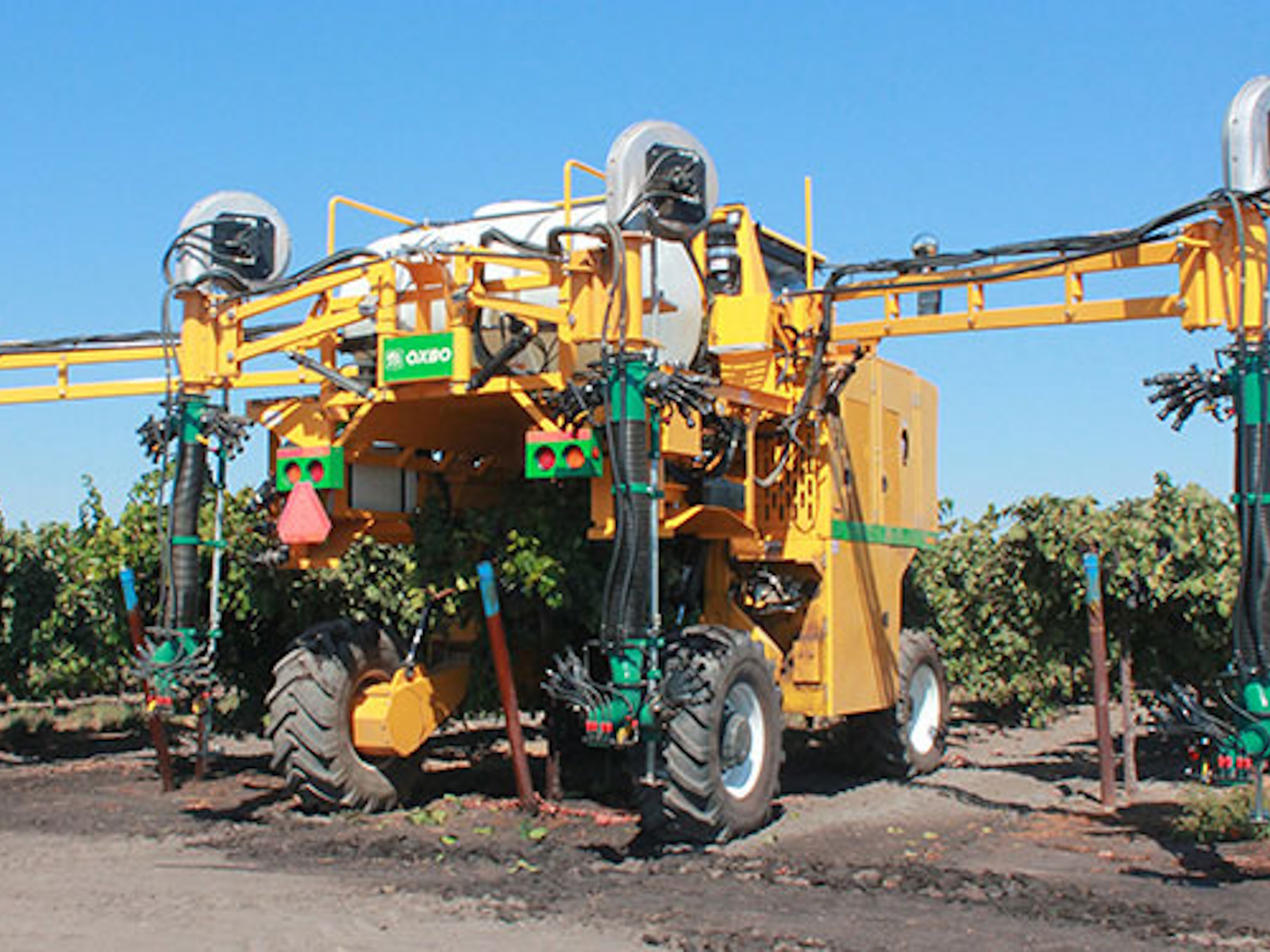 The new Oxbo 640 Multi-Row sprayer is compatible with the Oxbo 6030 vineyard power unit. With the ability to install or remove from the power unit in under 30 minutes, the 640 delivers new technology and efficiency to the vineyard. The Oxbo 640 features a 625 or 900 gallon product tank and a 50 gallon rinse tank and each row is controlled by an independent fan for more control over product application.