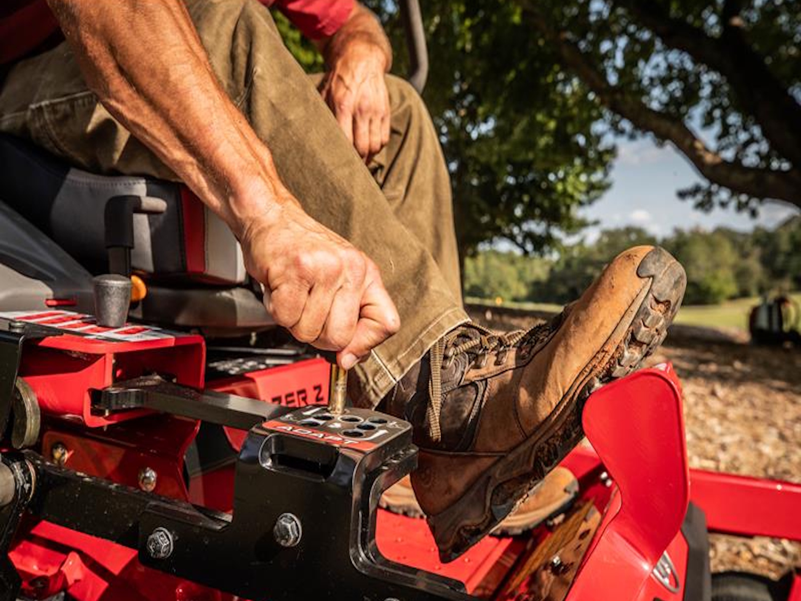 • Adjust deck rake quickly and easily without tools, from the operator seat, to optimize cut quality and performance in a variety of turf types and conditions. Adapt is particularly useful when mowing in wet, overgrown, or lush conditions, or stemmy grasses and weeds.